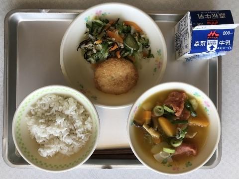 今日のメニューは、①むぎご飯 ②トマトだご汁 ③かみかみたこメンチ ④野菜の昆布和え ⑤牛乳です。