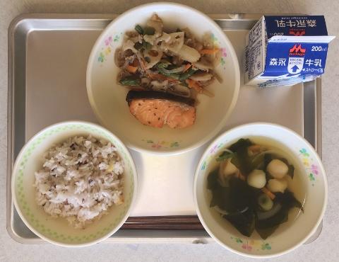 今日のメニューは、①ざっこくご飯 ②けんちん汁 ③さけのホイル包み焼き ④切り干し大根の酢の物 ⑤牛乳です。