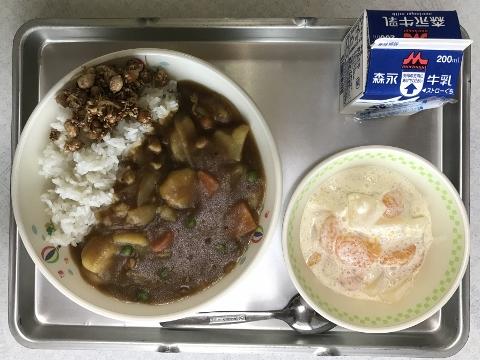 今日のメニューは、①むぎご飯 ②ポークカレー ③大豆ちりめん ④豆乳クリーム和え ⑤牛乳です。