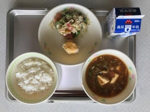 今日のメニューは、①むぎご飯 ②かき玉汁 ③揚げ出し豆腐の肉味噌あんかけ ④じゃこと野菜の和え物 ⑤牛乳です。