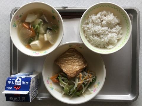今日のメニューは、①むぎご飯 ②けんちん汁 ③肉詰めいなりの煮物 ④アスパラのごま和え ⑤牛乳です。