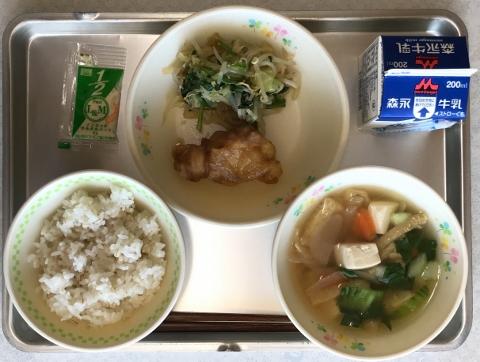 今日のメニューは、①むぎご飯 ②豆腐汁 ③チキン南蛮 ④じゃこと野菜の和え物 ⑤牛乳です。