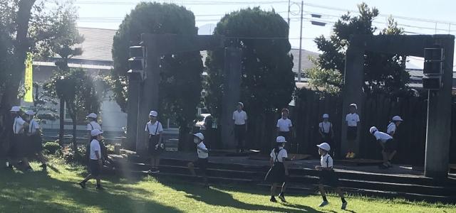8月24日(月) 朝の登校指導の様子です。朝だというのに日差しが強く動くと汗が出てきます。今日も保護者地域の方のご協力で、子供達が安全に登校できました。あいさつ運動をなくしたので、登校指導に4名の保護者に立って頂いています。大変ありがとうございました。