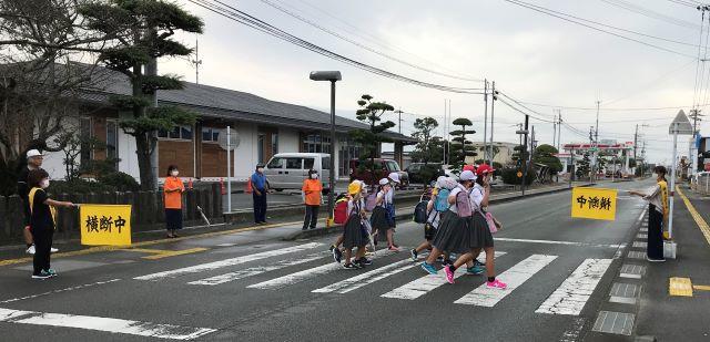 10月5日(月)今朝の登校指導の様子です。今日も保護者地域の皆様の協力で子供たちが安全に登校できていました。また、子供たちのあいさつの様子と止まってくれた車へのお礼がよくできていることをほめていただきました。この状態を継続することと各地域でもできるようになってくれることを目標にしています。ご指導よろしくお願いします。