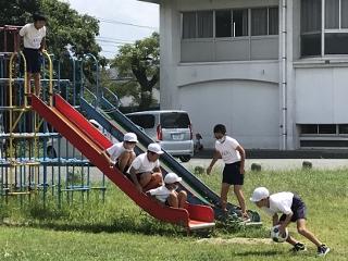 8月31日(月) 今日もとても暑い中、子供達は、鬼ごっこやサッカー、シーソー、野球、ダンス等で元気に遊んでいました。私は、1周見て回っただけで汗びっしょりになりました。子どもたちは本当に元気です。