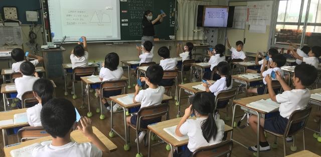 9月4日(金) 3校時、3年2組算数「あまりのあるわり算」の中学年研究授業を行いました。4個ずつ箱に入れていく問題で、あまりが3個出たとき、箱数をどのように考えるかの学習でした。4個ずつ入れて5箱必要とあまりを入れるから6箱必要という考えが2つに分かれ、理由を出し合いながら進められていました。
