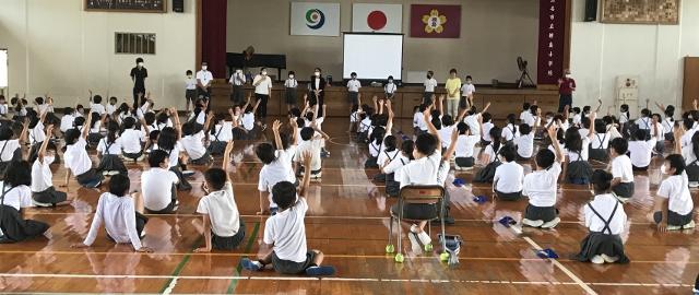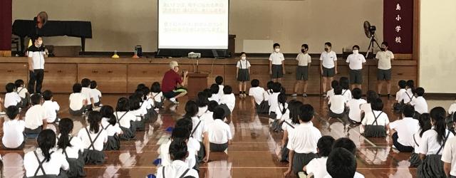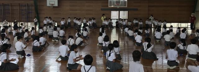 7月1日(水) 7月集会を体育館で1mの距離をとりながら行いました。内容は、私からは、コロナ感染症の流行の中、どのように過ごしていくか考え、考動力を高めよう。生徒指導担当からは、あいさつや登校の仕方とあいさつが上手な個人(6年生)と登校班の紹介、友だちとの距離を保つ委員会の取組、そして、1年生と新しく赴任された先生方の紹介でした。