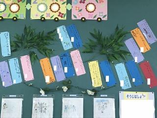 7月3日(金) 校舎を見回っていると、すてきな掲示物に出会いました。七夕飾りです。1年生が取り組んでいました。