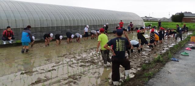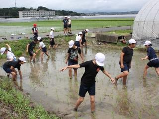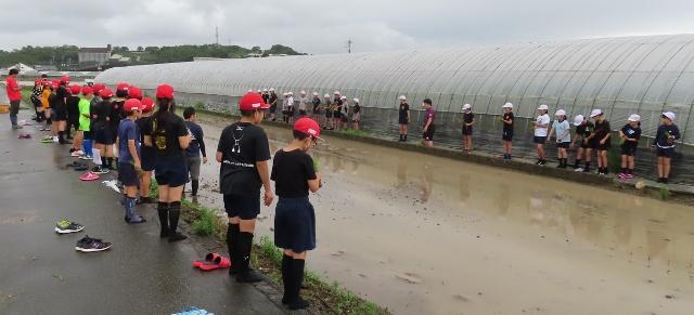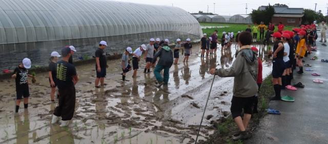 6月30日(火) 5校時、5年生が田植えを行いました。前川さんのご指導の下、4Hクラブの若手農業者の協力がありました。子供達は、貴重な体験となりました。写真は、始まるまでの写真です。植えているところの写真は、後ほどご紹介する予定です。