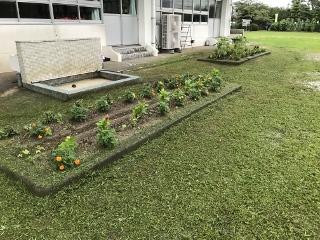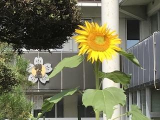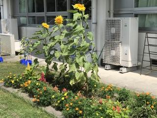 8月4日(火) 途中で植え替えたひまわりと1年生の花壇に昨年度のこぼれ種から育ったひまわりが咲いています。