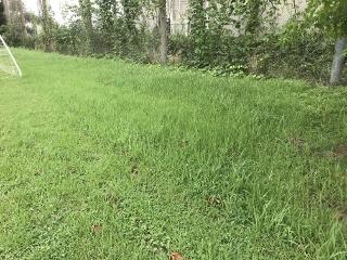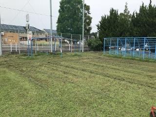 7月27日(月) 雨の合間を縫って、樹木剪定をしました。フェンスからはみ出している枝を中心に剪定しました。写真は、グリーンステージ裏の様子です。あっという間に樹木が伸びていました。
