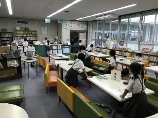 7月10日(金) 昼休みの図書室の様子と5時間目の水泳に向かう3年2組です。残念ながらカミナリの心配が出てきたので、途中でやめることになりました。