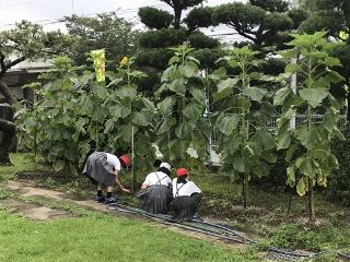 7月13日(月) 朝、ひまわりの草取りをしてくれている子供達と、虫取りをしている子供達です。セミを2匹捕まえていました。