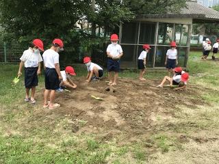 7月15日(水) 今日の業間のグリーンステージの様子です。一生懸命虫取り(トンボ、セミ)をしている子供達と図工「すなやつちとなかよし」の続きをしている子供達がいました。