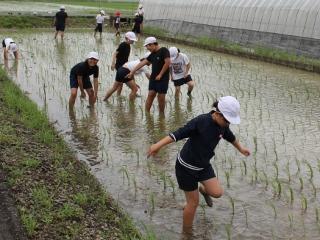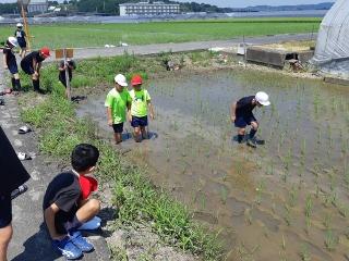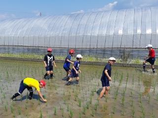 7月17日(金) 5校時に5年生が、学校田に草取りに出かけました。今年度は、田植えと稲刈りだけではなく、途中の手入れも少しは体験するためです。田んぼの中で転んでしまったこどももいたようです。