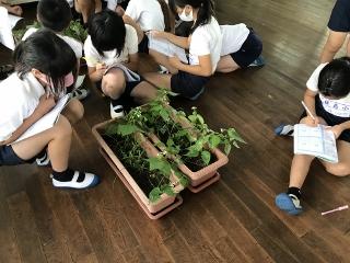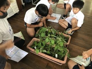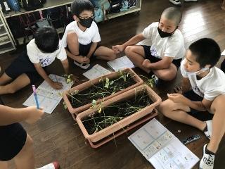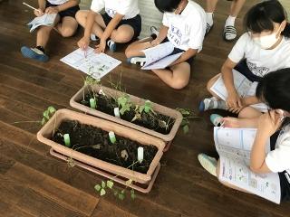 7月28日(火) 授業を見回っていると、廊下で理科の観察が行われていました。肥料あり日光あり、肥料なし日光あり、肥料あり日光なし、肥料なし日光なしで育ったインゲン豆の観察です。違いから見えてくるものは何なのでしょう。最近の悪天候で、理科の学習はとてもやりにくい状況です。室内で観察できる工夫の中で行われていました。