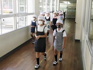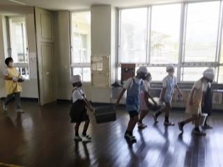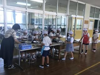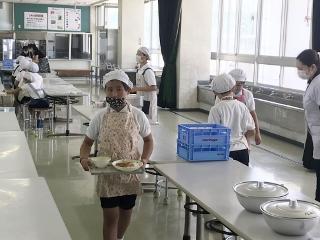 7月31日(金) 給食の準備と食べているところの様子です。現在は、1年生、2年生、4年生がランチルームで給食を食べ、他の学年は、教室で食べるようにしています。