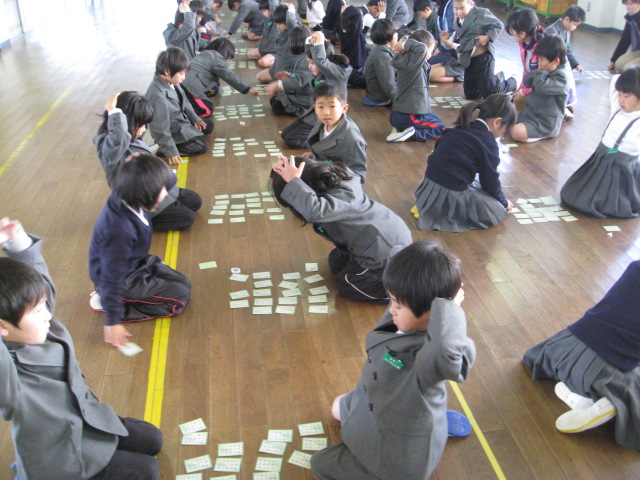 1年生は、お正月らしく学年で百人一首をしました。1組と2組がペアになり、相手を代えながら7回ぐらい対戦しました。なかには上の句を聞いただけで、札を取れる子どももいました。とっても楽しそうに対戦していました。