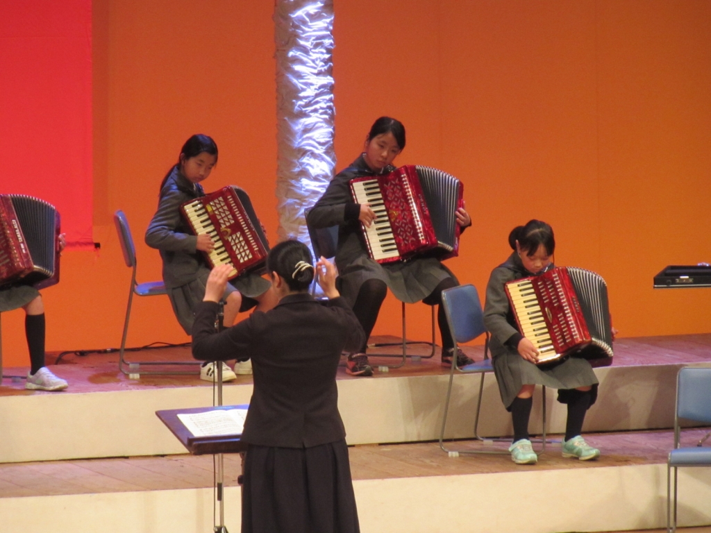 合奏部が参加し、アコーディオンなどで「シンコペーティッド・クロック」と「にじいろ」を演奏しました。