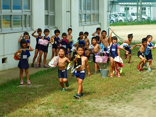 1年生は、水着に着替えて、砂遊びと 水泳の時間!!
