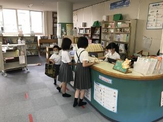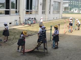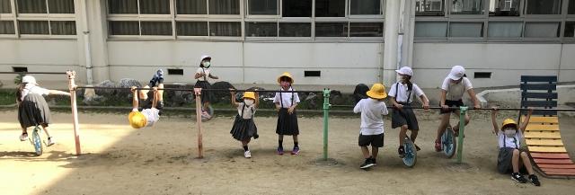 6月5日(金) 朝の様子です。図書室で本を借りている子供達、中庭で一輪車や鉄棒で遊んでいる子供達です。