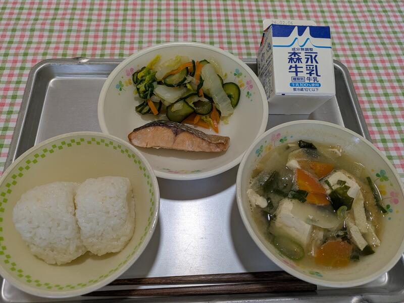 今日のメニューは、おにぎり、大根の味噌汁、魚の塩焼き、白菜の即席漬け、牛乳でした。