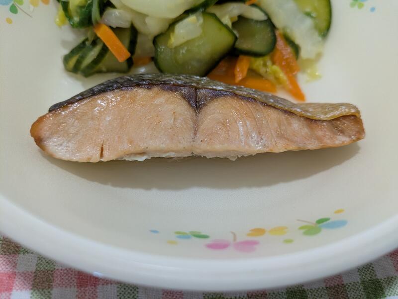 魚の塩焼きは、鮭の切り身を一切れ、一切れ、スチームコンベクションで焼き上げてあり、ほどよい塩加減で、皮と身の食感もとてもよくて、おいしい魚の塩焼きでした。