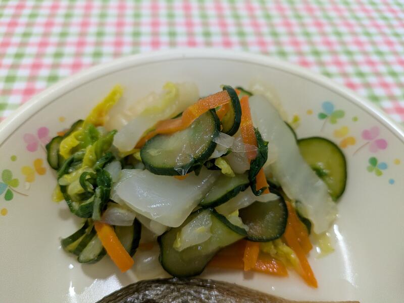 白菜の即席漬けは、白菜に胡瓜、人参をほどよい甘酢につけてあり、おにぎりや鮭の塩焼きの塩味によく合っていて、とてもおいしかったです。