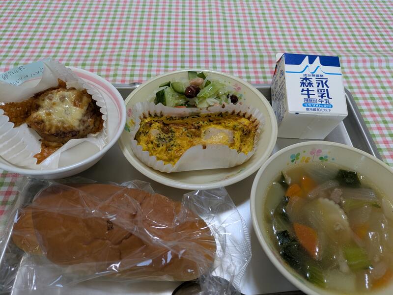 今日のメニューは、ミルクパン、ラビオリスープ、スパニッシュオムレツ(卵アレルギー対応は、ハンバーグ。)、豆サラダ、牛乳でした。