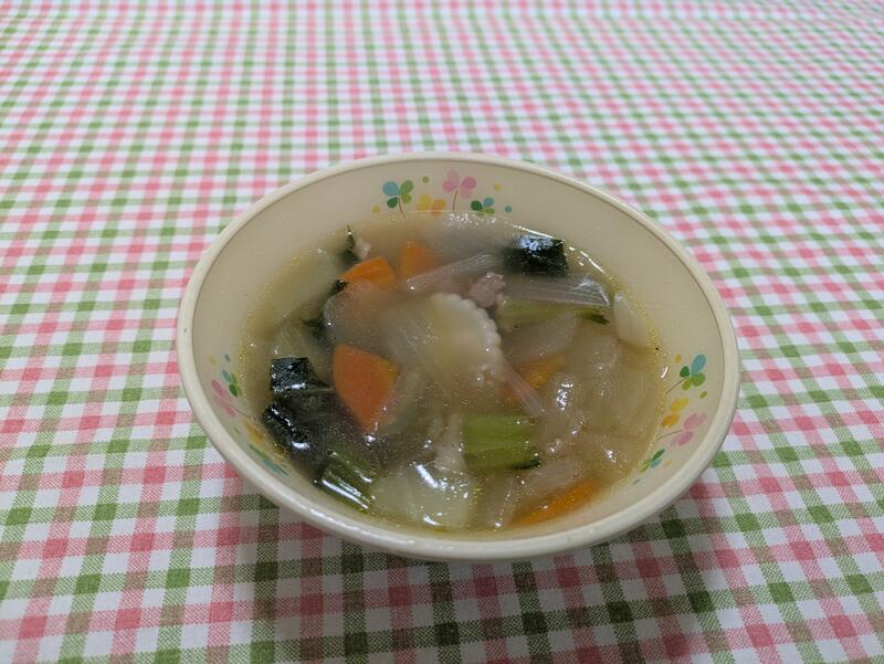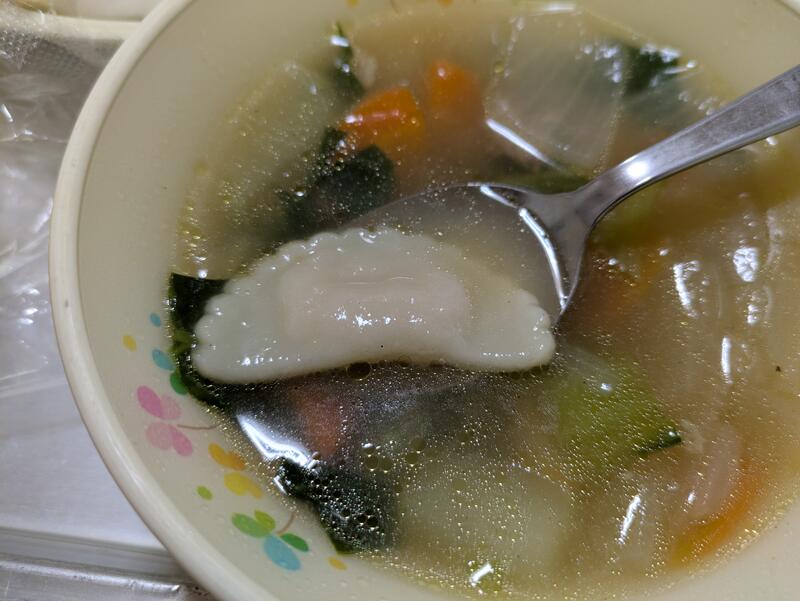 今日はそのラビオリと人参、玉ねぎ、チンゲン菜をチキンブイヨンとコンソメスープで煮込んでありました。具材の旨味と出汁がラビオリに絡んで、温かくて、とてもおいしい逸品のスープでした。