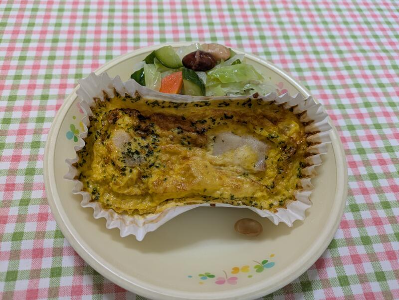 スパニッシュオムレツは、スペインの伝統的な卵料理のことで、横島小のスパニッシュオムレツは、一つ一つ手作りで、じゃがいもとたまねぎを、チーズを混ぜた卵に入れてスチームコンベクションで焼き上げてありました。チーズと塩加減がとても合っていて子どもたちも喜んで食べていました。