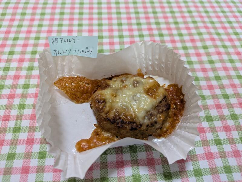卵アレルギー対応は、ハンバーグにチーズをのせてスチームコンベクションで焼き上げてありました。卵アレルギーの子どもも喜んで食べていました。給食の先生方に心から感謝します。さすが横島小学校です。