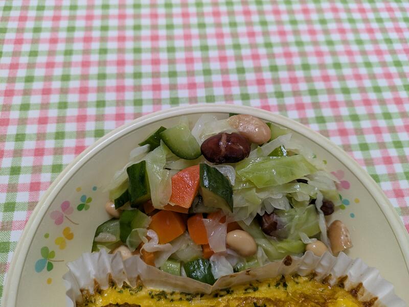 豆サラダは、良質な植物性タンパク質が豊富なミックスビーンズをキャベツや人参、胡瓜と甘酸っぱい手作りドレッシングで味付けしてありました。今日もたくさんの豆と野菜をサラダでおいしく食べられてうれしかったです。