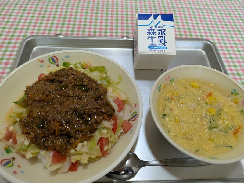 今日のメニューは、タコライス、コーンと卵のスープ(卵アレルギー対応は、卵なし。)、トマトサラダ、牛乳でした。今日は給食週間の2日めで、メキシコ料理でした。