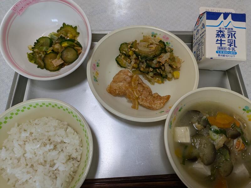 今日のメニューは、麦ご飯、茄子のみそ汁、ささ身のレモン漬け、ゴーヤのナッツ和え(ピーナッツアレルギーは、ピーナッツなし。)、牛乳でした。