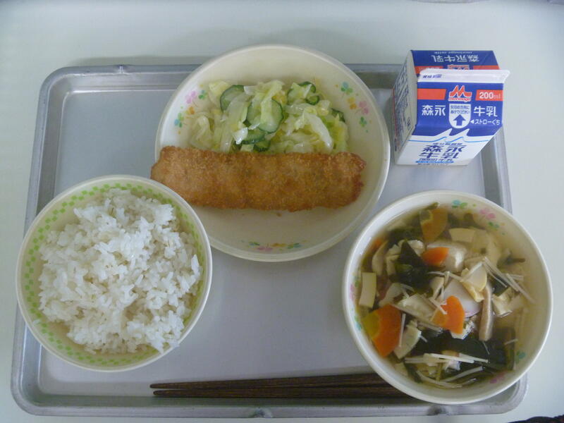 今日の献立は、むぎごはん、牛乳、わかたけじる、太刀魚フライ、甘夏みかんサラダです。