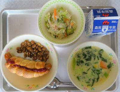 6月1日(水)の給食「手作りパンの日」 投稿日時 : 2022/06/01 承認者 メニュー:〇手作りウィンナーパン 〇コーンクリームスープ(代替食:コンソメスープ) 〇ツナサラダ 〇黒糖ナッツ(除去食:ピーナツなし) 〇牛乳