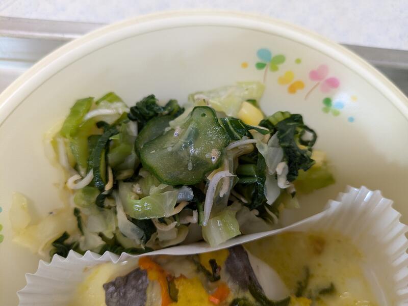 じゃこサラダは、キャベツと胡瓜、チンゲン菜に、子どもたちが好きなコーンと、サラダに程よい量のじゃこが入れてあり、さっぱりした塩加減と、コーンの甘みがとても良いバランスのおいしい和のサラダでした。