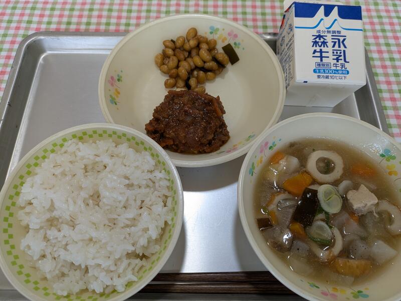 今日のメニューは、麦ご飯、のっぺい汁、豆腐の味噌あんかけ、座禅豆、牛乳でした。
