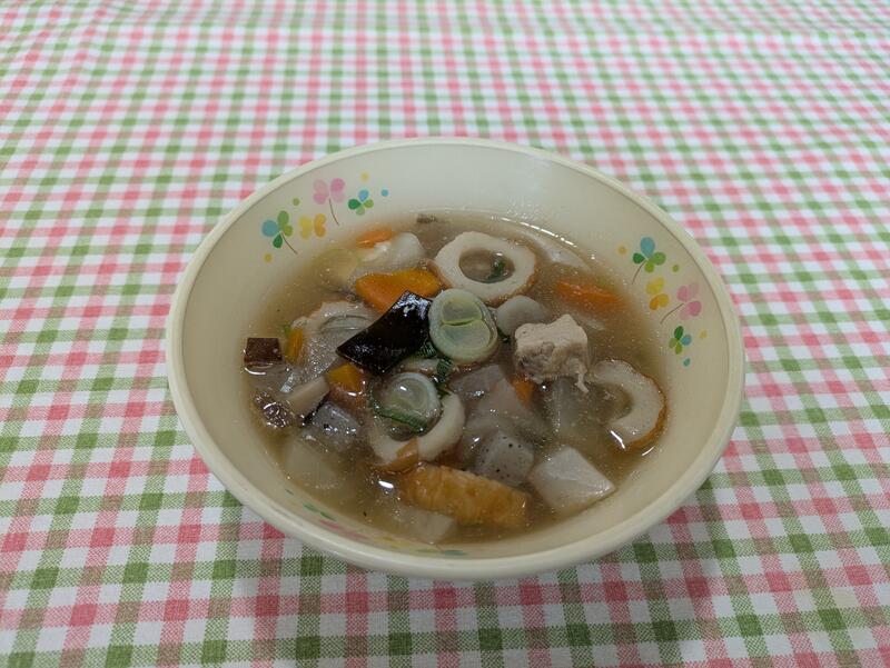 のっぺい汁は、鶏肉に大根、人参、ごぼう、里芋、ねぎ、椎茸、そして、地元の山本豆腐店の厚揚げと、たくさんの具材を鰹と昆布の出汁に薄口醤油で味付けしてありました。具の旨味と出汁と薄口醤油がとてもよく、それを片栗粉が柔らかく包み込んでいて、温もりが冷めにくく、栄養満点のおいしい汁でした。