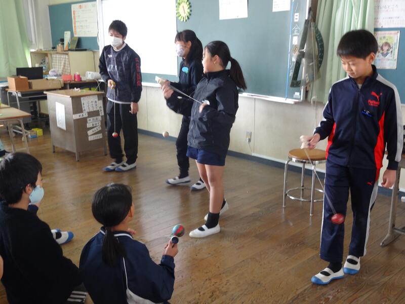 「けん玉チャレンジ」 班員全員で、けん玉の大皿に玉を乗せることができた人の数で点数がもらえるゲームです。