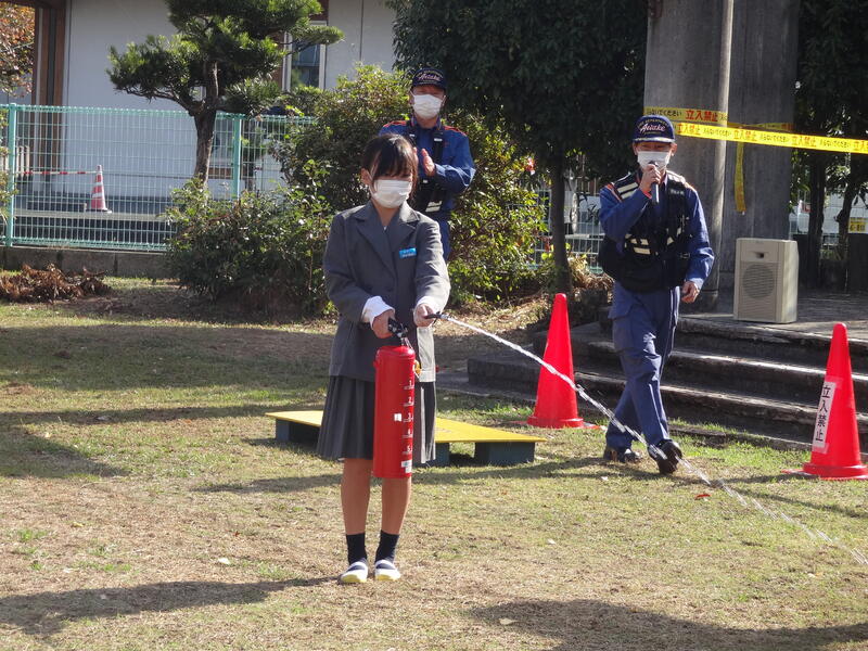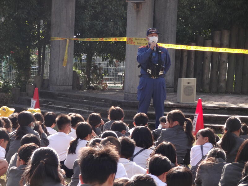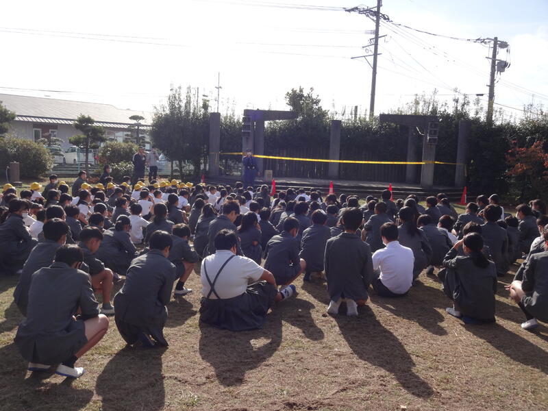 今回は、家庭科室から火災が発生したと想定して避難訓練を行いました。有明消防署の天水分署からゲストティーチャーとして来ていただき、避難の様子や火災に対して、自分たちができる対応等を指導していただきました。