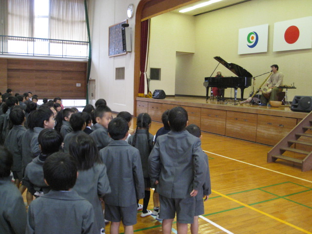 11月21日(金)玉名市のアウトリーチ事業で音楽鑑賞会がありました。「おとのわmusic」という玉名市在住の川原さん、藤川さんのお2人の演奏や歌がありました。カリンバやジュンベという外国の民族楽器の楽しい演奏やきれいな歌声に子どもたちが大喜びでした。