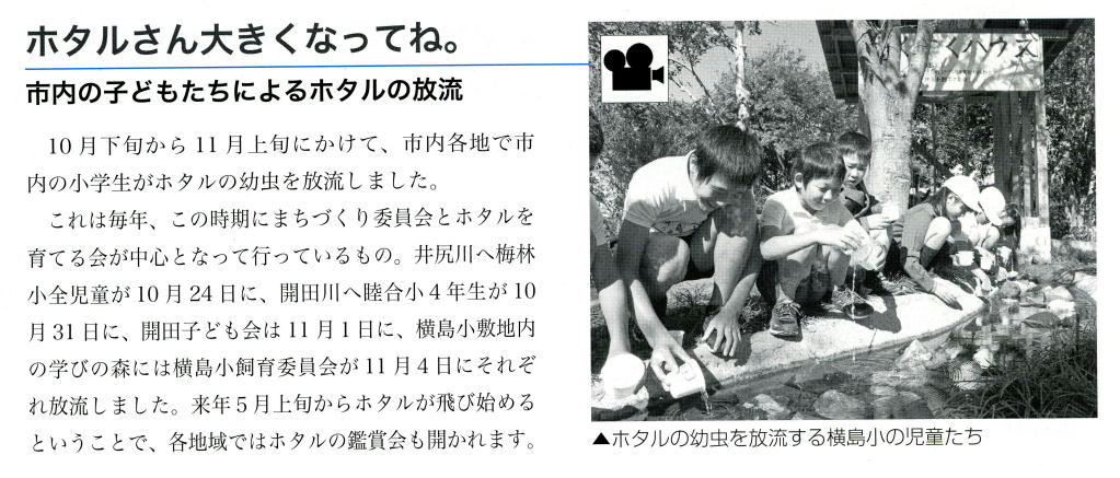 ★広報たまな12月号で、11月4日におこなった学びの森でまちづくり委員会の方々と飼育委員会の児童が行ったホタルの幼虫の放流の様子が紹介されています。玉名市ホームページで動画も見られるようです。http://www.city.tamana.lg.jp/hisho/koho.html