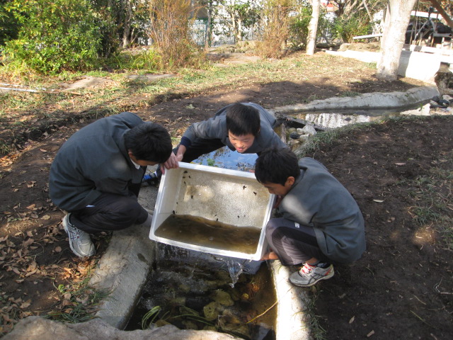 職員室で観察用にホタルの幼虫を数百匹程度飼育していましたが、冬休みに入るので、学びの森の水路に放流しました。飼育委員長と6年生男子2名が昼休みに行いました。