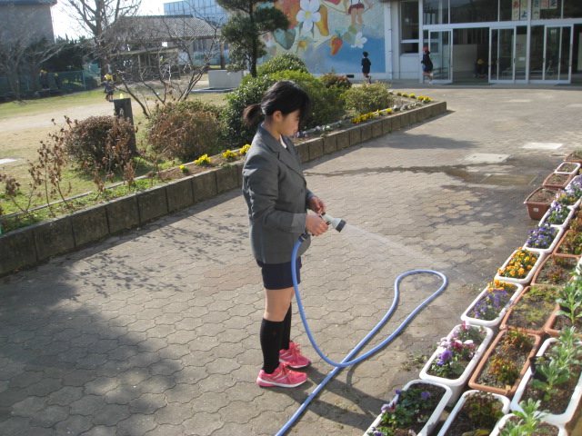栽培委員会のおかげで横島小学校は花いっぱいの学校になっています。朝と昼毎日水やりをしています。