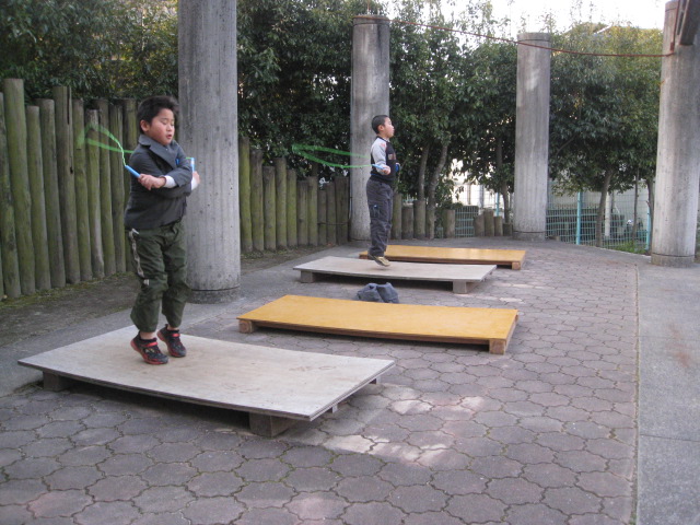 横島老人会副会長の田上孝則さん(右写真)になわとび練習用のジャンプボードを、冬休み中に2台新しく作っていただきました。子どもたちは、朝登校してから、業間の自由遊び、昼休み等なわとびをしています。