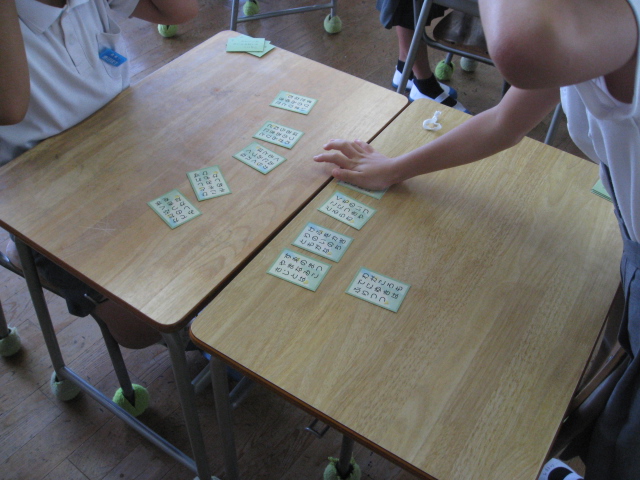 6月29日(月)朝の学習タイムで、月曜日は五色百人一首をしています。先生が読む句を「よく聞く」、札を「よく見る」ことで集中トレーニングにもなっています。カルタ遊びをしながら、百人一首をおぼえ、しかも集中力が身に付きます。