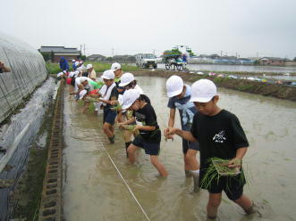 6月22日(月)5年生が田植えに行きました。5月から稲の苗をワークスペースで育てていました。ちょっと育ちすぎでひょろひょろしているのもありましたが、無事田植えができました。
