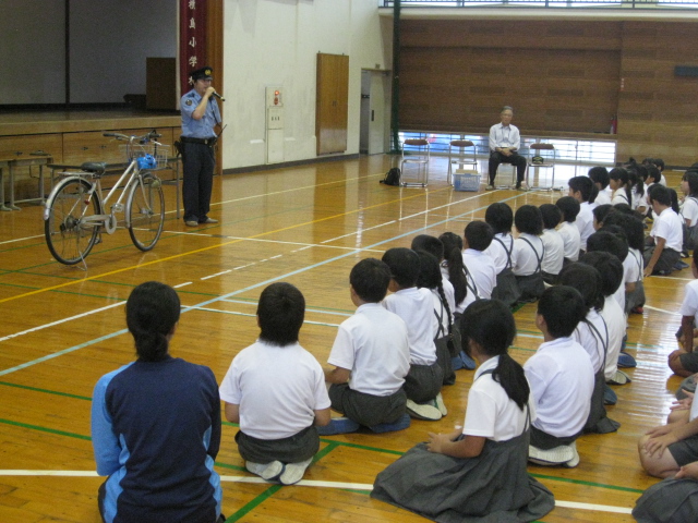 安全協会や横島駐在所より指導に来ていただき、交通教室がありました。4年連続雨天で体育館での指導になりました。ビデオを見たり、模擬体験をしたりして交通安全の学習をしました。低学年は自分の命を守る、高学年は自分だけでなく下級生や周りの人のことまで考えて、自分とみんなの命を守ることを学習しました。